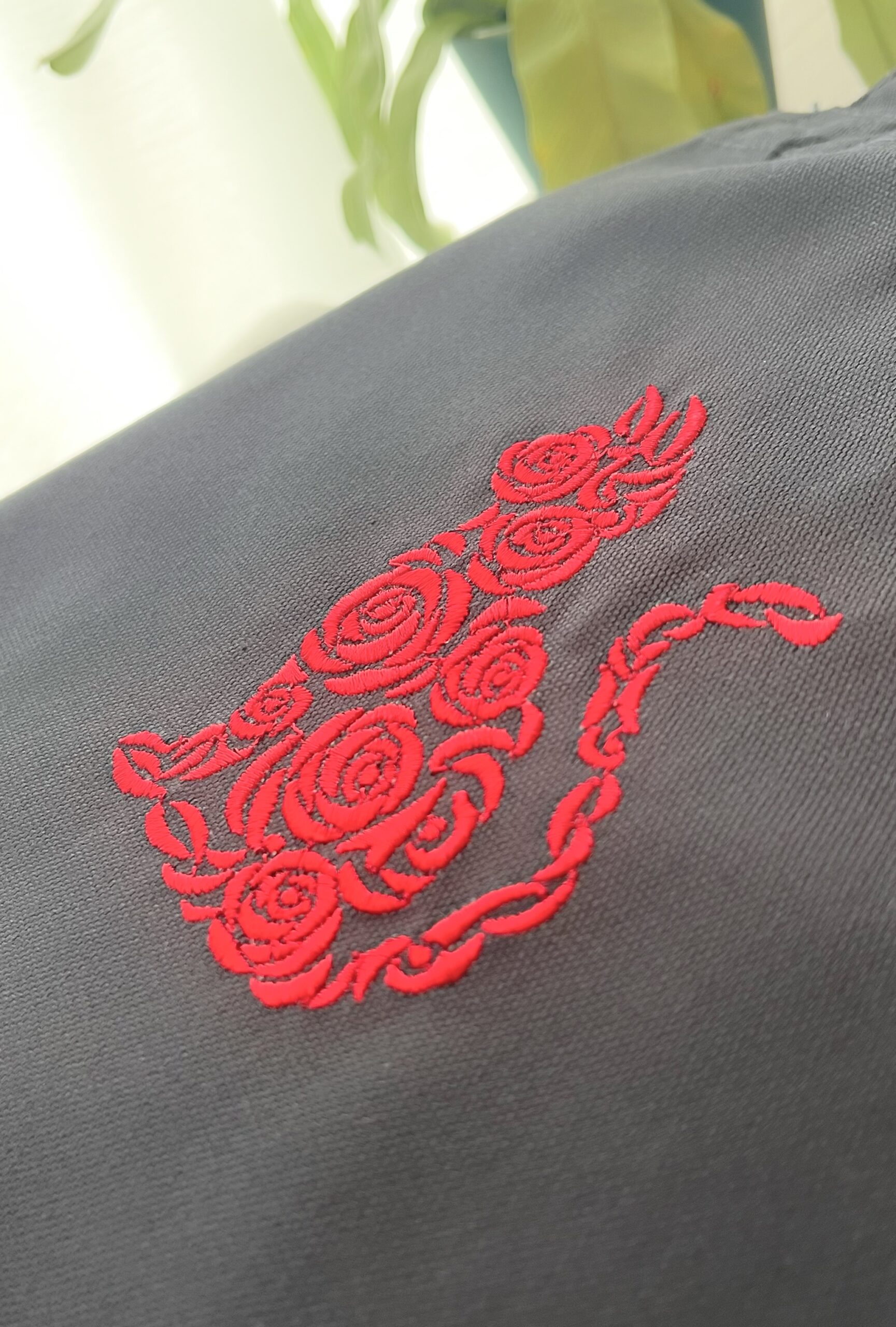 深みのあるネイビー生地に、赤いバラで形作られた猫「ローズキャット」を刺繍しました。
