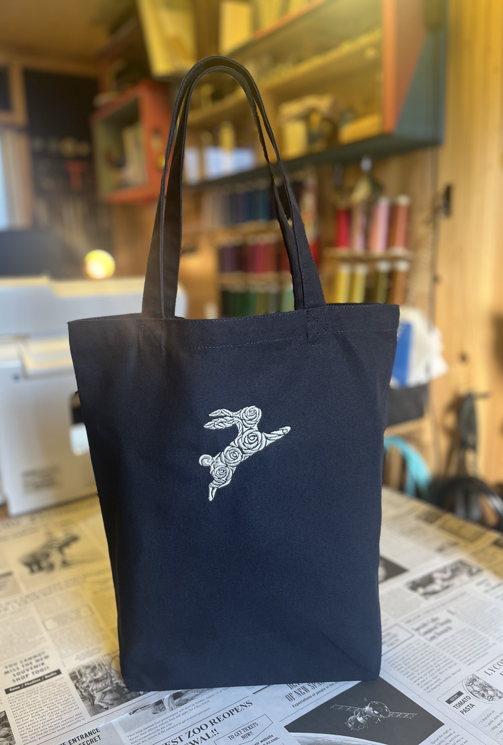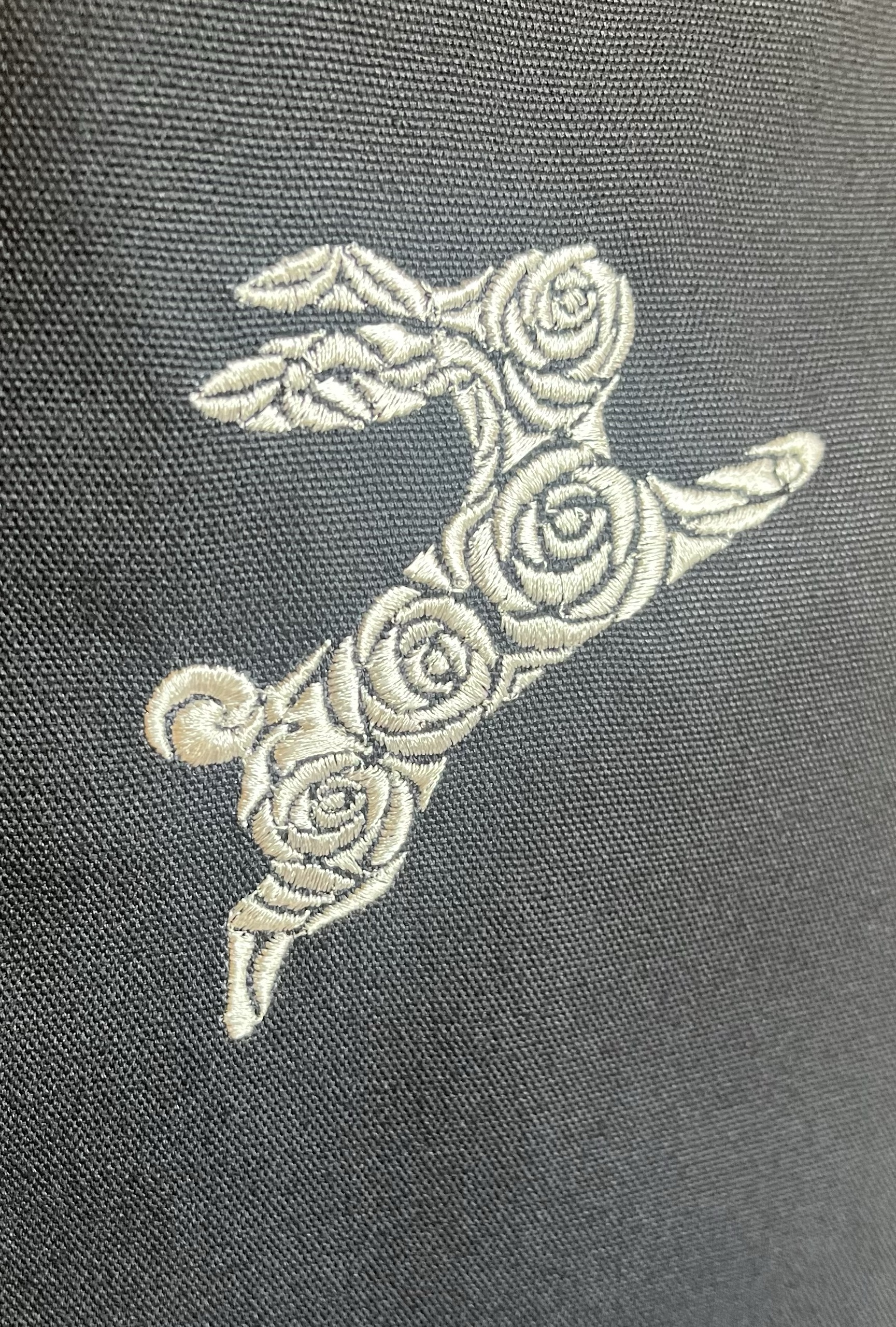 深みのあるネイビー生地に、白い薔薇で形作られた猫「ローズラビット」を刺繍しました。