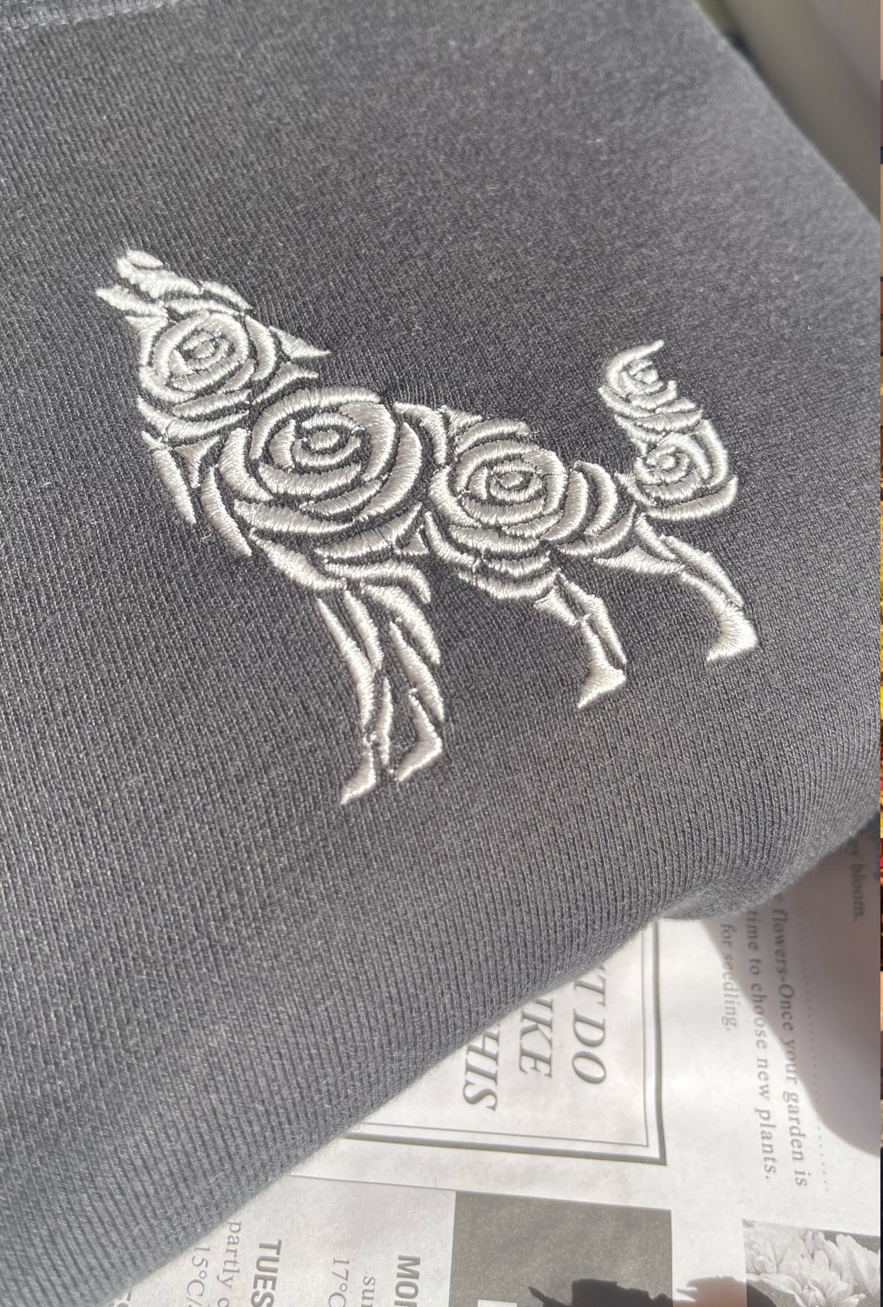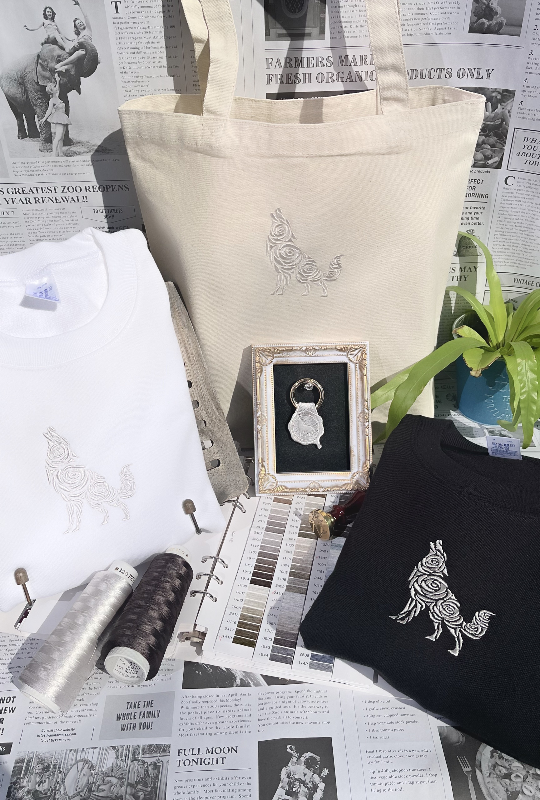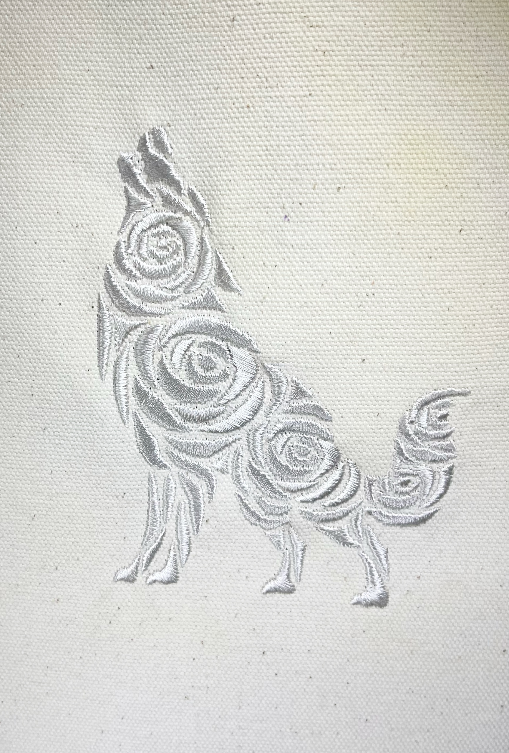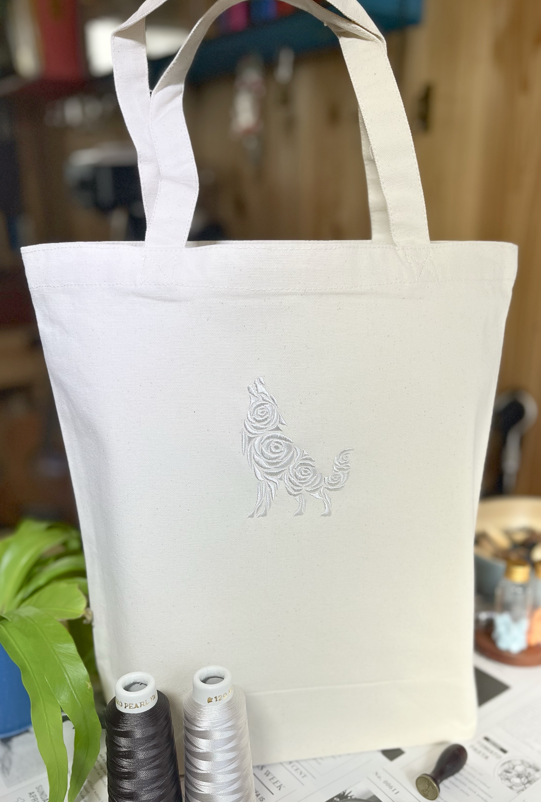 狼を薔薇の刺繍でデザインしたスウェット・刺繍リング・トートバッグです。