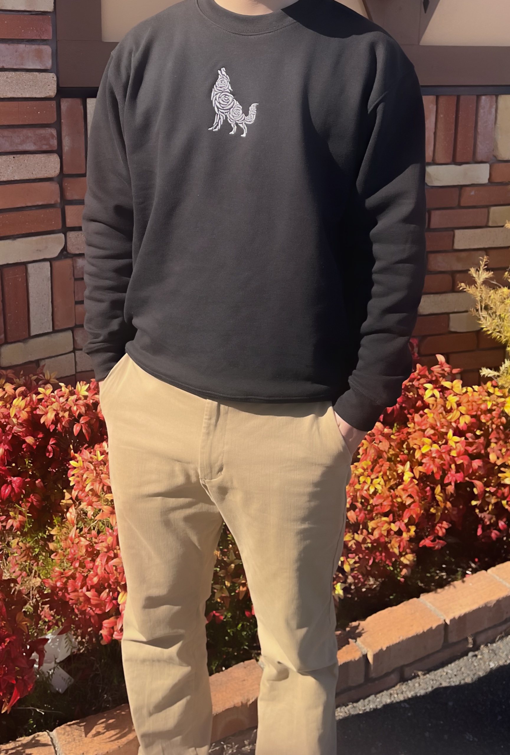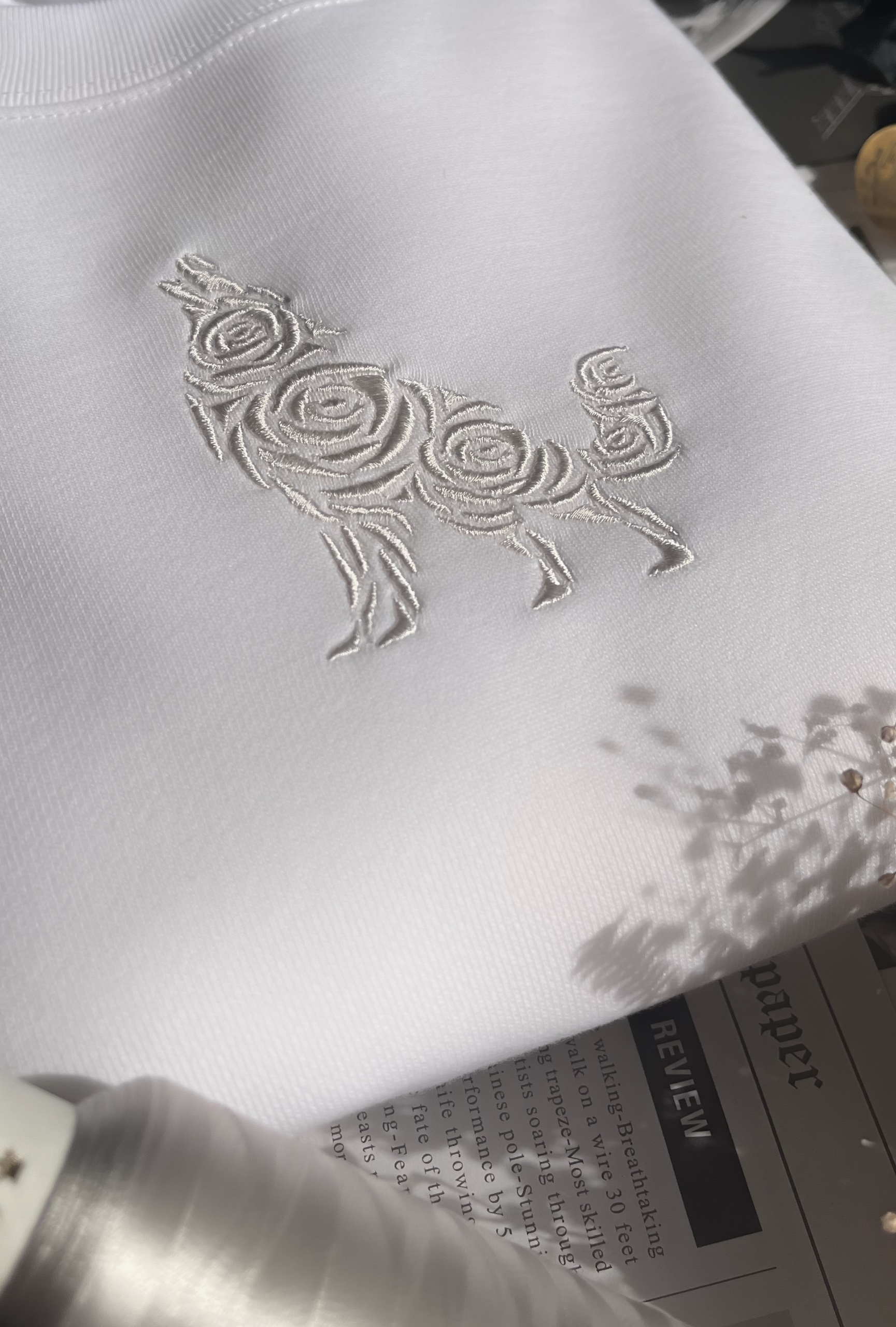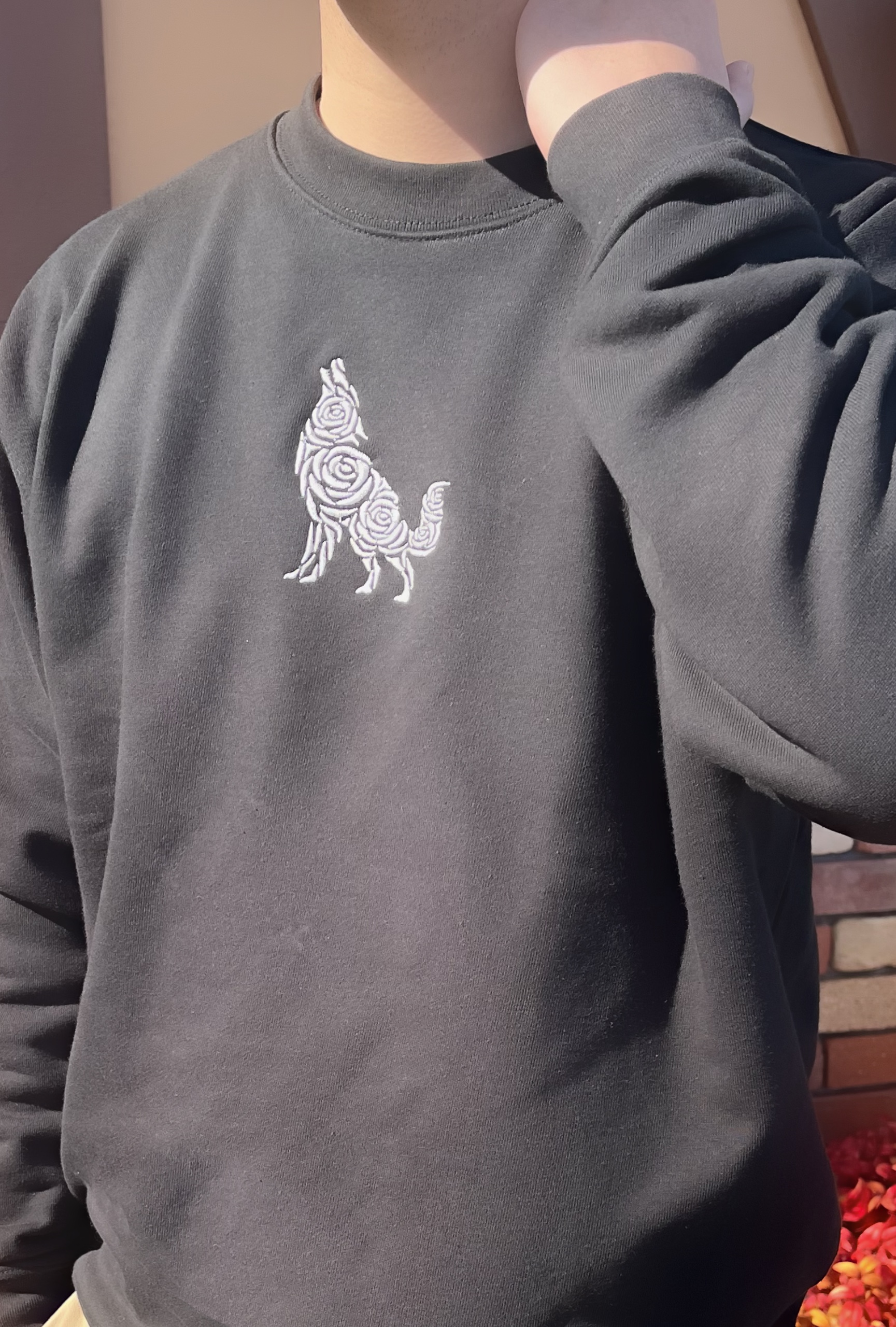 狼を薔薇の刺繍でデザインしたスウェット・刺繍リング・トートバッグです。