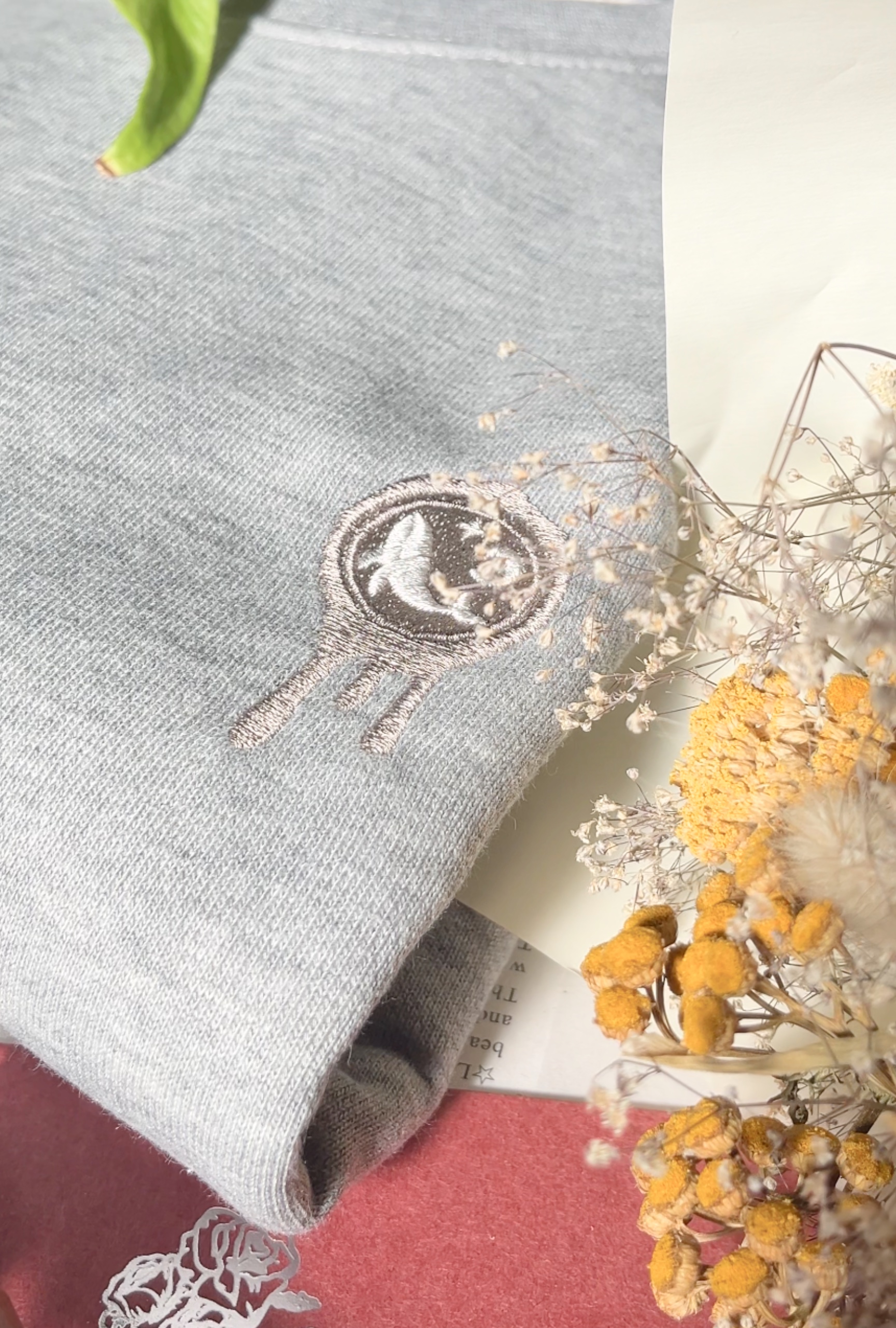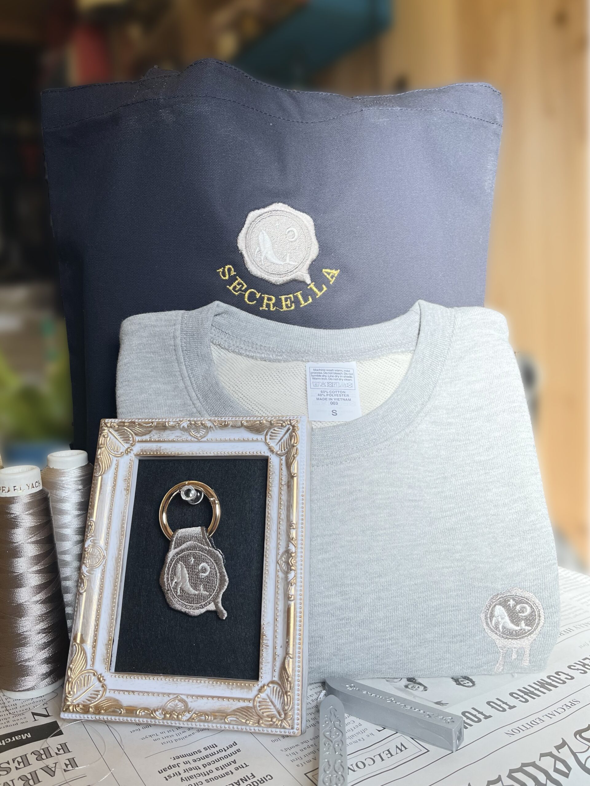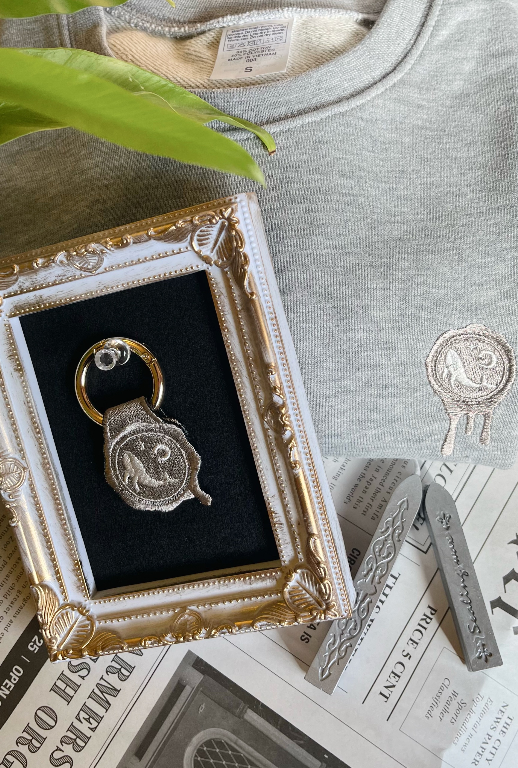 シーリングスタンプを刺繍でデザインしたスウェット・刺繍リング・トートバッグです。